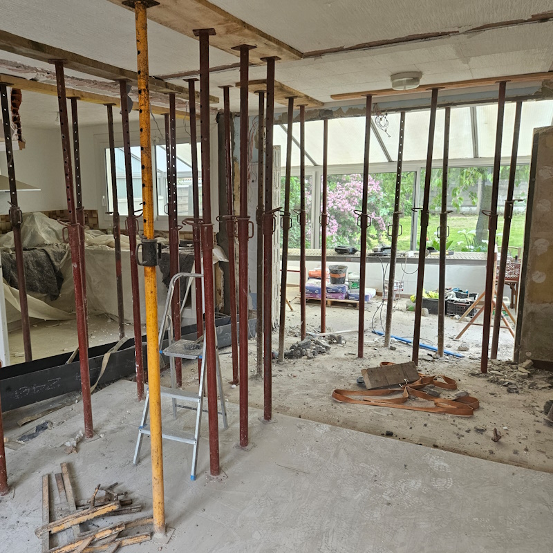 Passage cuisine-séjour, création de double porte, accès garage : nous assurons l’ouverture de mur porteur avec l’appui d’éléments acier ou béton, dimensionnés pour votre bâti (pierre, brique, parpaing, béton coulé).