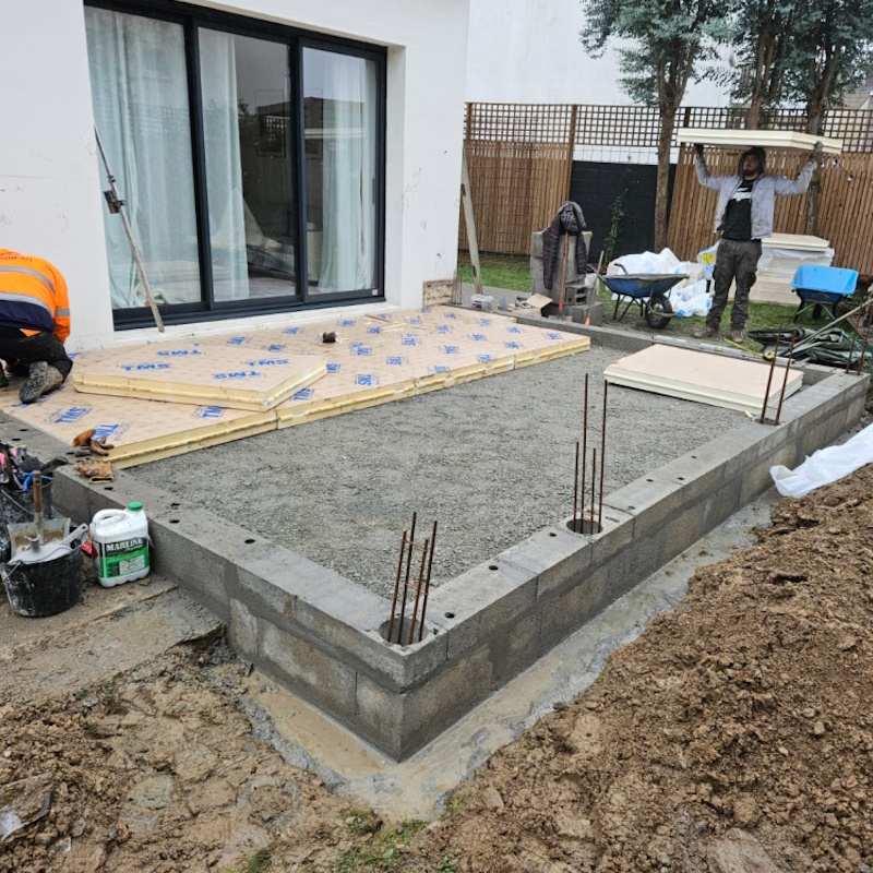 Tout commence dans le sol. Avant de voir les murs s’élever, nous préparons le terrain. Creuser, ferrailler et couler les fondations de la maison constitue la première étape critique. Nous adaptons la profondeur et le type de semelles à la nature du sol de Carquefou ou de la région nantaise pour éviter tout mouvement futur. Une fois cette base stabilisée, nous montons les murs, qu’ils soient en parpaings, en briques ou en béton banché. Notre parc matériel nous permet d’être autonomes et de gérer ces travaux de gros œuvre avec une grande fluidité, sans dépendre de locations externes qui pourraient ralentir le chantier.